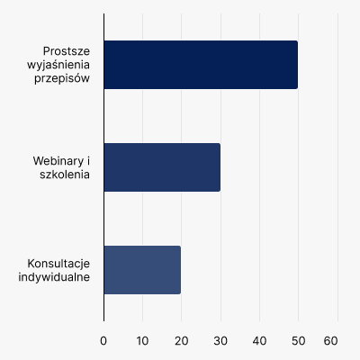• Respondenci wskazują potrzebę prostszych materiałów edukacyjnych oraz dostępu do szkoleń i konsultacji.